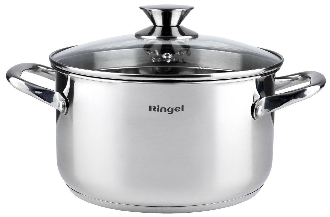 Кастрюля с крышкой RINGEL Hanover Объём: 2.3 л. Диаметр: 18 см. Толщина стенок: 0.5 мм. Материал кастрюли: высококачественная нержавеющая сталь. Материал ручек: высококачественная нержавеющая сталь (клепочное крепление) Материал крышки: жаропрочное стекло (с клапаном для выпуска пара и метал. широким бортом с отверстиями для слива воды) Отделка: зеркальная внешняя и внутрення полировка корпуса. Тройное капсульное дно. Внутренние отметки литража. Подходит для всех видов плит, включая индукционные. Подходит для использования в посудомоечных машинах.